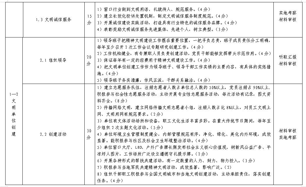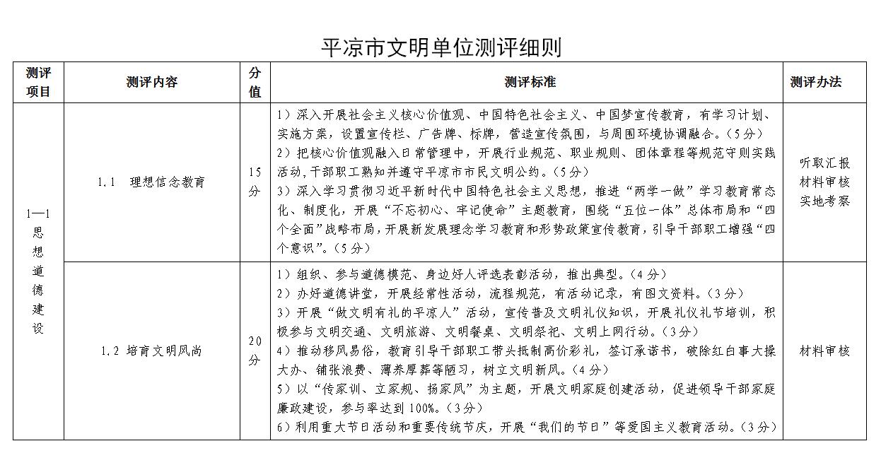 說 明 一、為規(guī)范市級文明單位考核測評工作,提高市級文明單位創(chuàng)建活動水平,參照《甘肅省文明單位測評細則》(2020年版),制訂本細則。 二、根據(jù)創(chuàng)建文明單位工作實際,測評細則共設置思想道德建設和文明單位創(chuàng)建兩大項目,5項測評內(nèi)容,25條測評標準,滿分為100分。采用實地考察、材料審核、聽取匯報三種方法進行測評。 三、市級文明單位每兩年評選表彰一次,依據(jù)《平?jīng)?/span>市文明單位測評細則》經(jīng)測評產(chǎn)生。 四、申報單位申報前兩年內(nèi),有下列情形之一的,不得申報市級文明單位:1.領(lǐng)導班子主要負責人嚴重違紀、違法犯罪被查處,受到撤銷黨內(nèi)職務(含)以上處分或行政撤職(含)以上處分,或被追究刑事責任;2.領(lǐng)導班子成員兩名(含)以上嚴重違紀、違法犯罪被查處,受到撤銷黨內(nèi)職務(含)以上處分或行政撤職(含)以上處分,或被追究刑事責任;3.單位或單位法人被列為失信聯(lián)合懲戒對象或被列入嚴重失信違法“黑名單”;4.員工違法犯罪被追究刑事責任(員工不超過500人的單位,有3人(含)以上被追究刑事責任;員工超過500人的單位,有5‰(含)以上的員工被追究刑事責任。);5.發(fā)生重大安全生產(chǎn)責任事故;6.發(fā)生重大食品藥品安全事故;7.發(fā)生負面影響較大的群體性事件;8.發(fā)生社會影響惡劣的“黃毒賭”案件;9.發(fā)生社會影響惡劣的邪教活動;10.創(chuàng)建工作滑坡嚴重,失去示范引領(lǐng)作用;11.發(fā)生嚴重道德失范、造成社會惡劣影響的其他惡性事件或案件;12.發(fā)生形式主義、弄虛作假、擾民行為等問題。 五、被測評單位提供的檔案材料必須符合下列要求:1. 提供的檔案材料應為測評前兩個年度的資料;2. 檔案資料為電子文檔或紙質(zhì)文件;3. 檔案資料須按“測評項目”分類編輯或裝訂成冊,并按“測評內(nèi)容”編寫目錄,注明頁碼;4. 被測評單位不便涉及某項指標的,應書面說明情況。 六、本細則由平?jīng)?/span>市精神文明建設指導委員會辦公室負責說明和解釋。