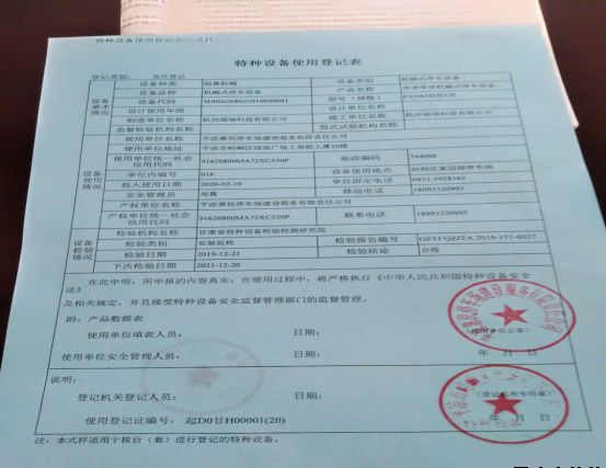 為保證果園路立體停車庫(kù)安全運(yùn)營(yíng),2019年12月15日設(shè)備安裝廠家委托甘肅省特種設(shè)備檢驗(yàn)檢測(cè)研究院對(duì)果園路立體停車庫(kù)設(shè)備進(jìn)行了現(xiàn)場(chǎng)檢驗(yàn),于2019年12月21日出具了檢驗(yàn)報(bào)告。按照特種設(shè)備管理辦法的要求,停車場(chǎng)公司積極銜接崆峒區(qū)質(zhì)量監(jiān)督局,提交了辦理特種設(shè)備使用登記證所需的各種資料及證明文件,2020年3月5日順利取得果園路立體停車庫(kù)特種設(shè)備使用登記證。