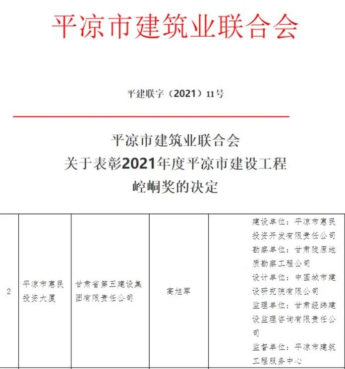 歲末年初,捷報(bào)頻傳,在公司上下歡慶惠民公司成立十周年之際,平?jīng)鍪薪ㄖ髽I(yè)聯(lián)合會(huì)發(fā)布《關(guān)于表彰2021年度平?jīng)鍪薪ㄔO(shè)工程崆峒獎(jiǎng)的決定》,由平?jīng)鍪谢菝裢顿Y開(kāi)發(fā)有限責(zé)任公司開(kāi)發(fā)建設(shè),房產(chǎn)公司具體實(shí)施的惠民投資大廈項(xiàng)目榮獲2021年度平?jīng)鍪薪ㄔO(shè)工程崆峒獎(jiǎng)。