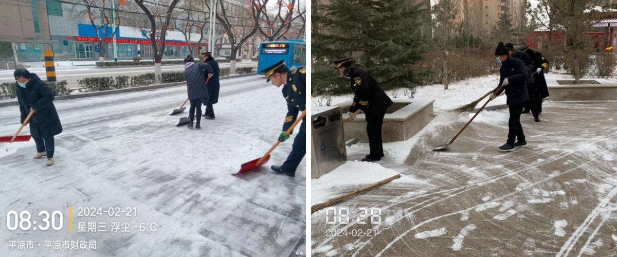 2月21日清晨,平?jīng)鲑e館全體職工就立刻奔赴各自負(fù)責(zé)的“戰(zhàn)場(chǎng)”,開展掃雪工作。大家不畏寒冷,拿起鐵鍬、掃帚等除雪工具,迅速開展清雪活動(dòng),及時(shí)消除道路安全隱患,為客人出行保駕護(hù)航。