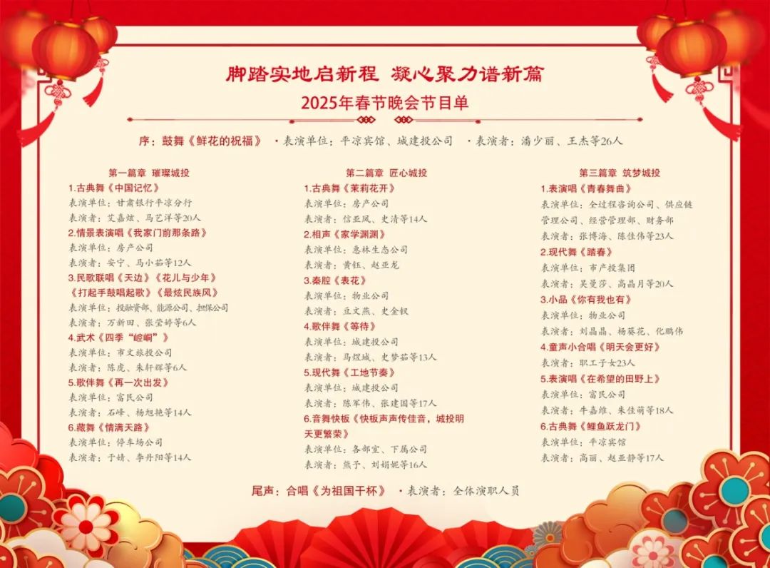 晚會(huì)以“腳踏實(shí)地啟新程·凝心聚力譜新篇”為主題,由《璀璨城投》《匠心城投》《筑夢(mèng)城投》三大篇章、共計(jì)20個(gè)節(jié)目組成,涵蓋精彩的歌舞、經(jīng)典的相聲小品、傳統(tǒng)的武術(shù)秦腔,還有充滿活力的童聲小合唱。