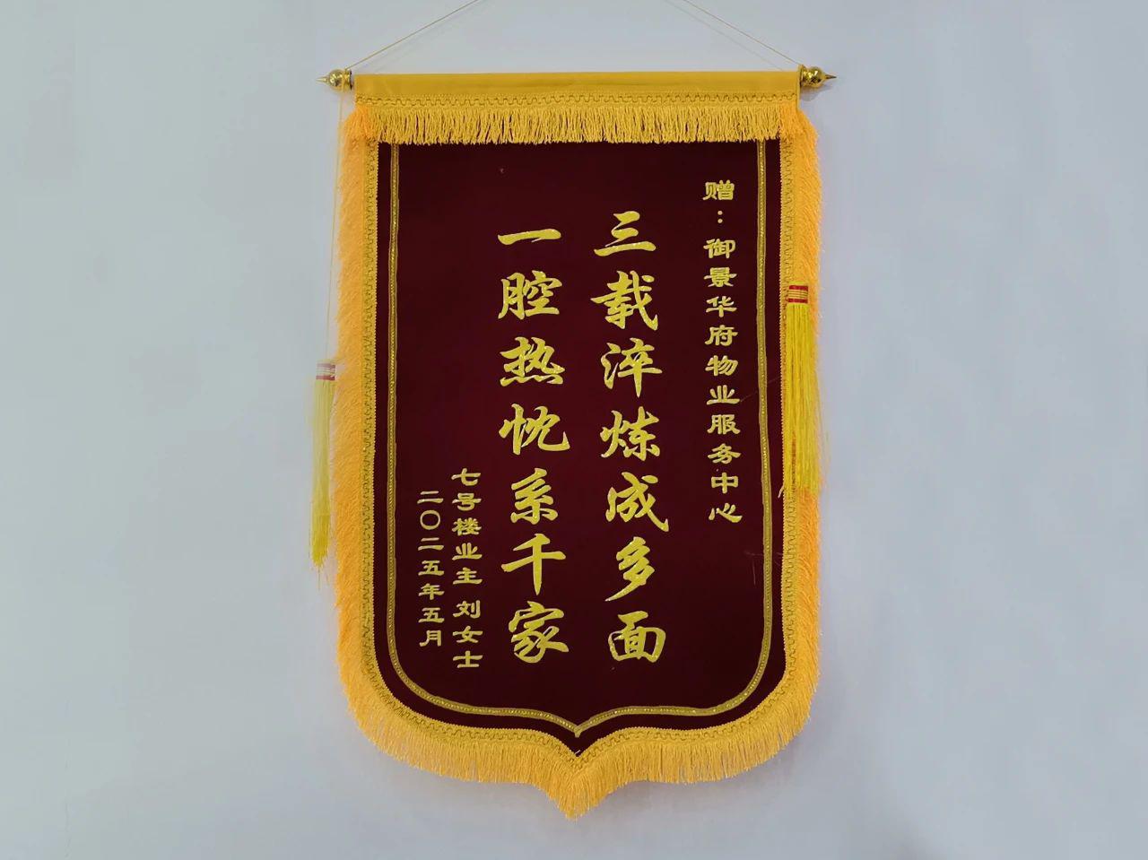 5月26日,御景華府小區(qū)業(yè)主劉女士向物業(yè)服務(wù)中心贈送了一面繡有“三載淬煉成多面,一腔熱忱系千家”的錦旗,并附上一封感謝信。