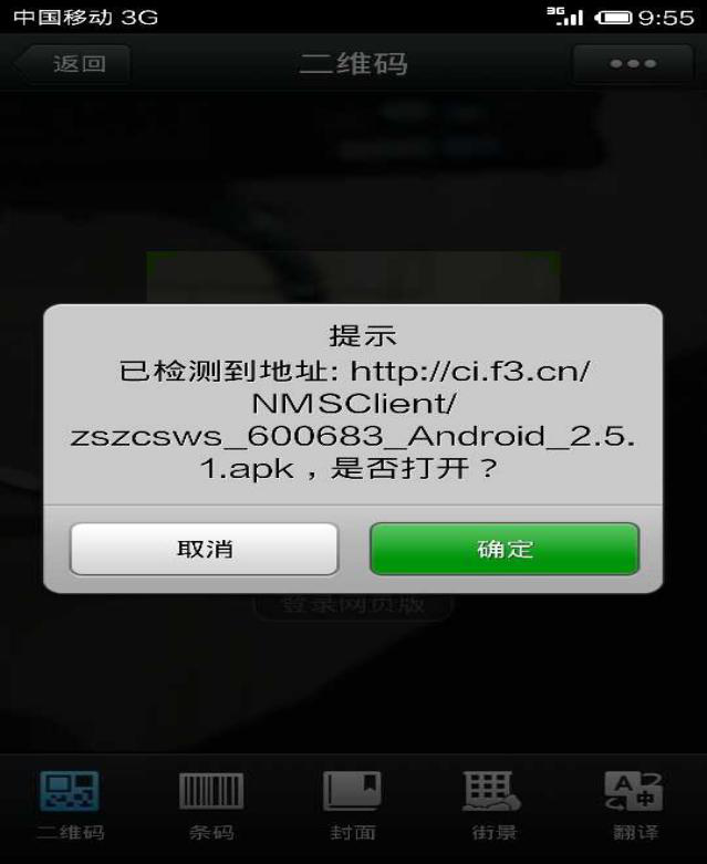 3.成功掃描后,會出現(xiàn)二維碼內(nèi)容,即APP下載鏈接地址,點擊確定即可跳轉(zhuǎn)到下載界面,點擊下載就能把APP下載到您的手機了。