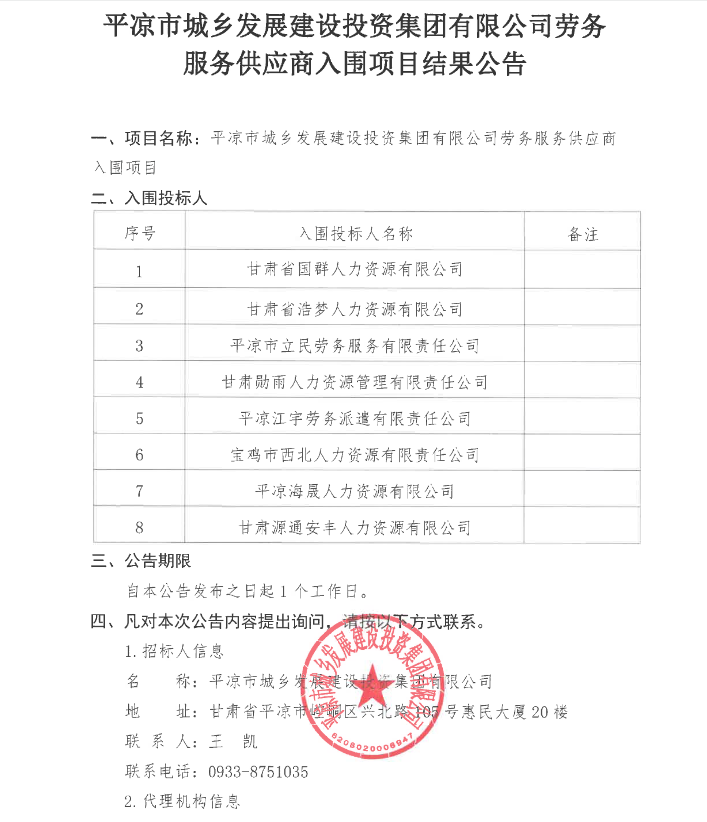 勞務(wù)服務(wù)供應(yīng)商入圍項目結(jié)果公告
